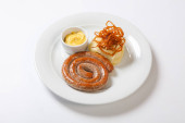 Puree i pieczona kiełbasa lub kiełbasy na białym talerzu