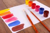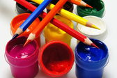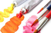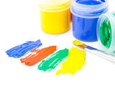 streszczenie farba gwasz, puszki i szczotki, na białym tle
