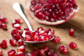 Granat plastry i nasiona na drewniane tła