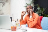 Afryki biznesmen przy użyciu jego laptopa siedząc w restauracji