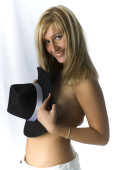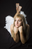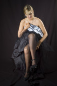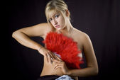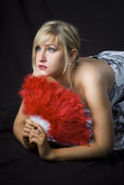 blondynka z wentylatorem czerwone pióro na czarnym tle