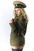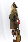 blondynka w starych radzieckich wojskowych postaci i czarne pończochy pozowanie Studio z tradycyjnych rosyjskich gitara akustyczna