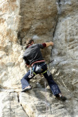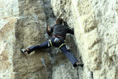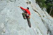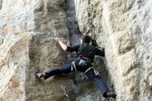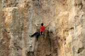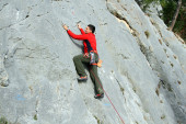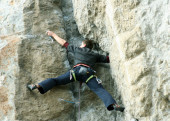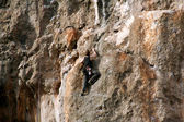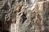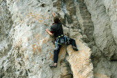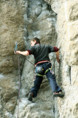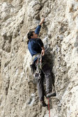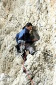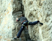 młody człowiek pionowa ściana wspinaczkowa z widokiem na dolinę na tle