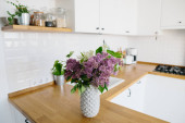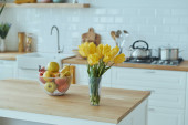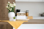 Widok wewnątrz eleganckiej minimalistycznej kuchni i jadalni. Nie ma ludzi.