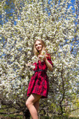 Dziewczyna w czerwonej sukience krótkiej na tle kwitnący sad jabłkowy