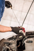 Ręce mężczyzny w jednorazowych rękawic sprawdzić poziom oleju w silniku.