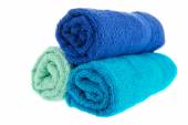 Żółty, zielony i czerwony zwinięte ręczniki na białym tle