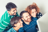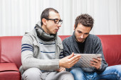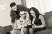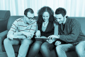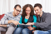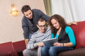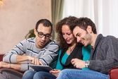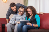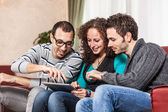 trzech przyjaciół z komputera typu tablet na kanapie