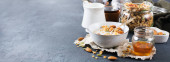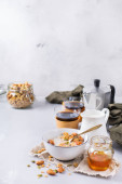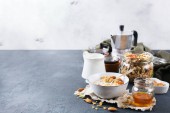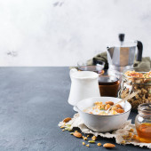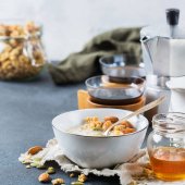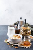 Śniadanie z czarnej kawy müsli muesli miód orzechy mleka