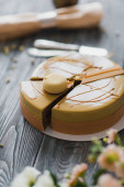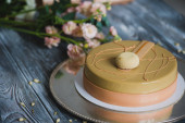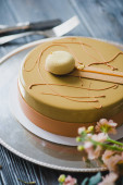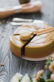 Zdjęcie "Widok z góry rąk gonna zjeść deser, ciasto mus żółty z confit laskowy dacquoise migdałów, Malina, chrupiącą warstwę z karmelizowanymi orzechy laskowe i malinowy w proszku, mus z gorzkiej czekolady w oparciu" może być wykorzystywane do celów osobistych i komercyjnych zgodnie z warunkami zakupionej licencji Royalty-free. Obraz jest dostępny do pobrania w jakości wysokiej rozdzielczości do 5760x3840.