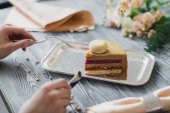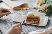 Widok z góry rąk gonna zjeść deser, ciasto mus żółty z confit laskowy dacquoise migdałów, Malina, chrupiącą warstwę z karmelizowanymi orzechy laskowe i malinowy w proszku, mus z gorzkiej czekolady w oparciu
