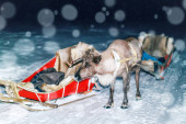 Renifery w farmie w śniegu wieczorem Laponia Fińska