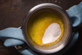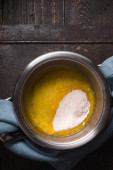 Przygotowanie sosu velouté na widoku z drewniany blat