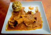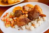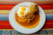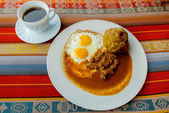 Bolon de verde z jajka sadzone i mięsa gulasz jedzenie ekwadorski galapagos