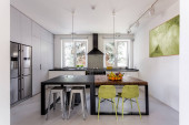 Zdjęcie "Jasne, funkcjonalna kuchnia z dwóch tabel" może być wykorzystywane do celów osobistych i komercyjnych zgodnie z warunkami zakupionej licencji Royalty-free. Obraz jest dostępny do pobrania w jakości wysokiej rozdzielczości do 5760x3840.