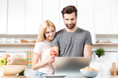 Uśmiechający się para przy użyciu notebooka do gotowania w kuchni