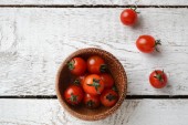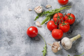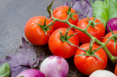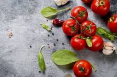 Wiśniowe pomidory na gałęzi, liści szpinaku i przyprawy