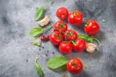 Zdjęcie "Wiśniowe pomidory na gałęzi, liści szpinaku i przyprawy" może być wykorzystywane do celów osobistych i komercyjnych zgodnie z warunkami zakupionej licencji Royalty-free. Obraz jest dostępny do pobrania w jakości wysokiej rozdzielczości do 5760x3840.