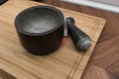 Szufelka drewno oliwne i drewniane miski na czarnym tle z łupków lub kamienia