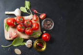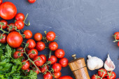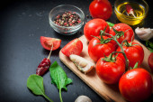 Wiśniowe pomidory na gałęzi, liści szpinaku i przyprawy