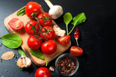 Zdjęcie "Wiśniowe pomidory na gałęzi, liści szpinaku i przyprawy" może być wykorzystywane do celów osobistych i komercyjnych zgodnie z warunkami zakupionej licencji Royalty-free. Obraz jest dostępny do pobrania w jakości wysokiej rozdzielczości do 5760x3840.