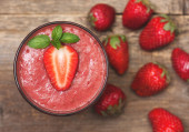 Koktajl truskawkowy lub mlecznego szkła na czarnym tle. Zdrowe jedzenie na śniadanie i przekąski. Pojęcie diety i detox