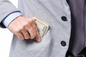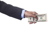 biznes człowiek ręka trzyma pieniądze na białym tle