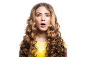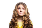 Zdjęcie "Portret znudzony dziewczyna z falisty fryzurę i żółte koszulki. Studio strzał na białym tle na białym tle. " może być wykorzystywane do celów osobistych i komercyjnych zgodnie z warunkami zakupionej licencji Royalty-free. Obraz jest dostępny do pobrania w jakości wysokiej rozdzielczości do 5760x3840.