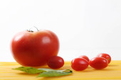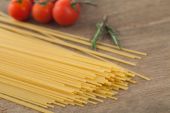 Spaghetti surowy makaron z pomidorami i bazylia na białym tle w b biały