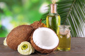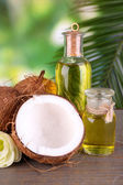karafka z oleju kokosowego i kokosy na zielonym tle