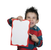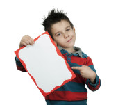 chłopiec, który śmieje się i przechowuje biały deska