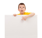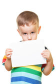 chłopiec, który śmieje się i przechowuje biały deska