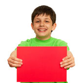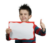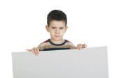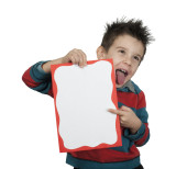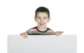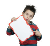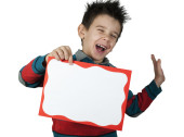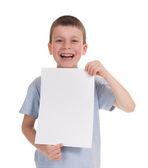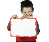 chłopiec, który śmieje się i przechowuje biały deska