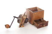 Stary stylowy młynek do mielenia kawy smaczne na biały na białym tle