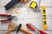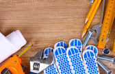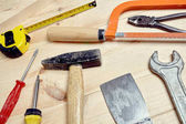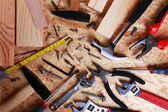 Zestaw narzędzi stolarskich na drewnianym tle, zbliżenie