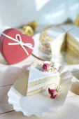 Zdjęcie "Piekarnia z piece of cake nietypowe żółty mus z migdałów laskowy dacquoise, malina confit, chrupiącą warstwę z karmelizowanymi orzechy laskowe i malinowy w proszku, mus w oparciu o gorzka czekolada serwowane w drewnianych" może być wykorzystywane do celów osobistych i komercyjnych zgodnie z warunkami zakupionej licencji Royalty-free. Obraz jest dostępny do pobrania w jakości wysokiej rozdzielczości do 5760x3840.