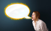 Zdjęcie "Młoda kobieta z nowoczesną bańką mowy" może być wykorzystywane do celów osobistych i komercyjnych zgodnie z warunkami zakupionej licencji Royalty-free. Obraz jest dostępny do pobrania w jakości wysokiej rozdzielczości do 5760x3840.