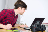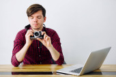 Zdjęcie "Człowiek jest czytanie wiadomości na smartfonie, siedzi przy stole w biurze i uśmiechając się" może być wykorzystywane do celów osobistych i komercyjnych zgodnie z warunkami zakupionej licencji Royalty-free. Obraz jest dostępny do pobrania w jakości wysokiej rozdzielczości do 5760x3840.