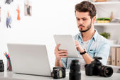 Człowiek jest czytanie wiadomości na smartfonie, siedzi przy stole w biurze i uśmiechając się