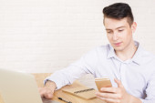Zdjęcie "Człowiek jest czytanie wiadomości na smartfonie, siedzi przy stole w biurze i uśmiechając się" może być wykorzystywane do celów osobistych i komercyjnych zgodnie z warunkami zakupionej licencji Royalty-free. Obraz jest dostępny do pobrania w jakości wysokiej rozdzielczości do 5760x3840.