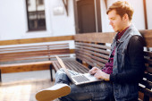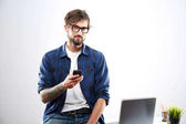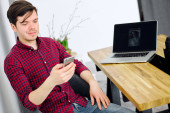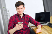 Człowiek jest czytanie wiadomości na smartfonie, siedzi przy stole w biurze i uśmiechając się