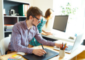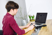 Człowiek młody i udane wykorzystuje lustra aparatu i siedzi przy stole z laptopem w biurze