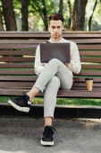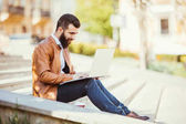 Młody facet siedzi na ulicy na ławce i używa laptopa. Pojęcie stylu życia i technologii