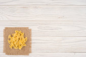 Makaron w szklanej misce na starym drewnianym stole.
