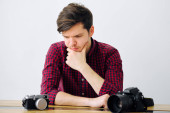 Młody facet w biurze siedzi przy stole i patrzy na kamery. Na stole lustra i lustra aparatu
