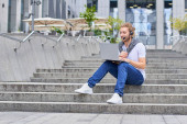 Zdjęcie "Młody facet siedzi na ulicy na schodach i używa laptopa i rozmowy na smartfonie. Pojęcie stylu życia i technologii" może być wykorzystywane do celów osobistych i komercyjnych zgodnie z warunkami zakupionej licencji Royalty-free. Obraz jest dostępny do pobrania w jakości wysokiej rozdzielczości do 5760x3840.