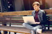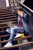 Młody facet siedzi na ulicy na schodach i używa laptopa i rozmowy na smartfonie. Pojęcie stylu życia i technologii