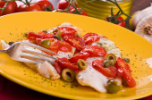Zdjęcie "Filet z ryby z pomidorkami i oliwy z oliwek." może być wykorzystywane do celów osobistych i komercyjnych zgodnie z warunkami zakupionej licencji Royalty-free. Obraz jest dostępny do pobrania w jakości wysokiej rozdzielczości do 5760x3840.