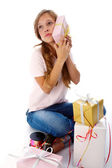 dziewczyna pozuje w biały t-shirt i dżinsy z pola prezenty