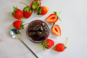 Duże truskawki zanurzone w czekoladzie w dłoni i klosz z mieszanki czekolady na białej powierzchni.